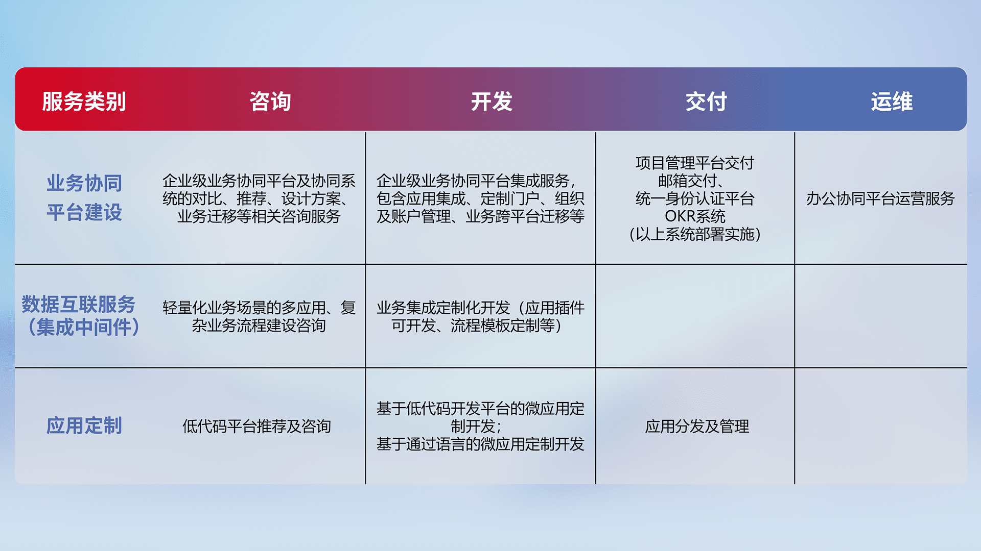 针对钉钉、、、、企微、、、、IDaas等平台级产品提供产品的规划、、、方案、、、交付、、、定制化开发等服务,,,实现如统一协同办公、、、、智能客户服务、、、混合会议管理、、智能数据查询、、等业务场景,,,实现数字化转型。。